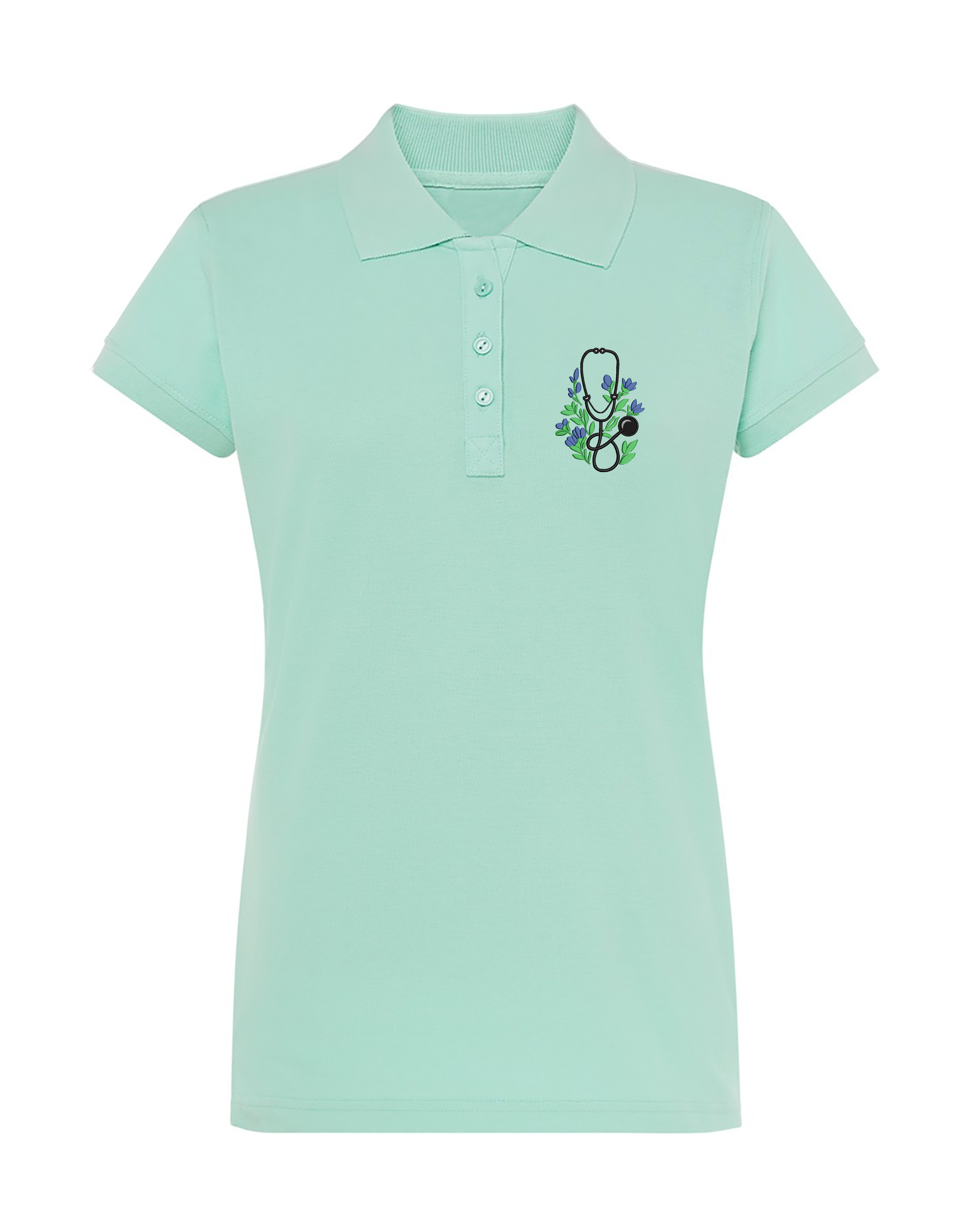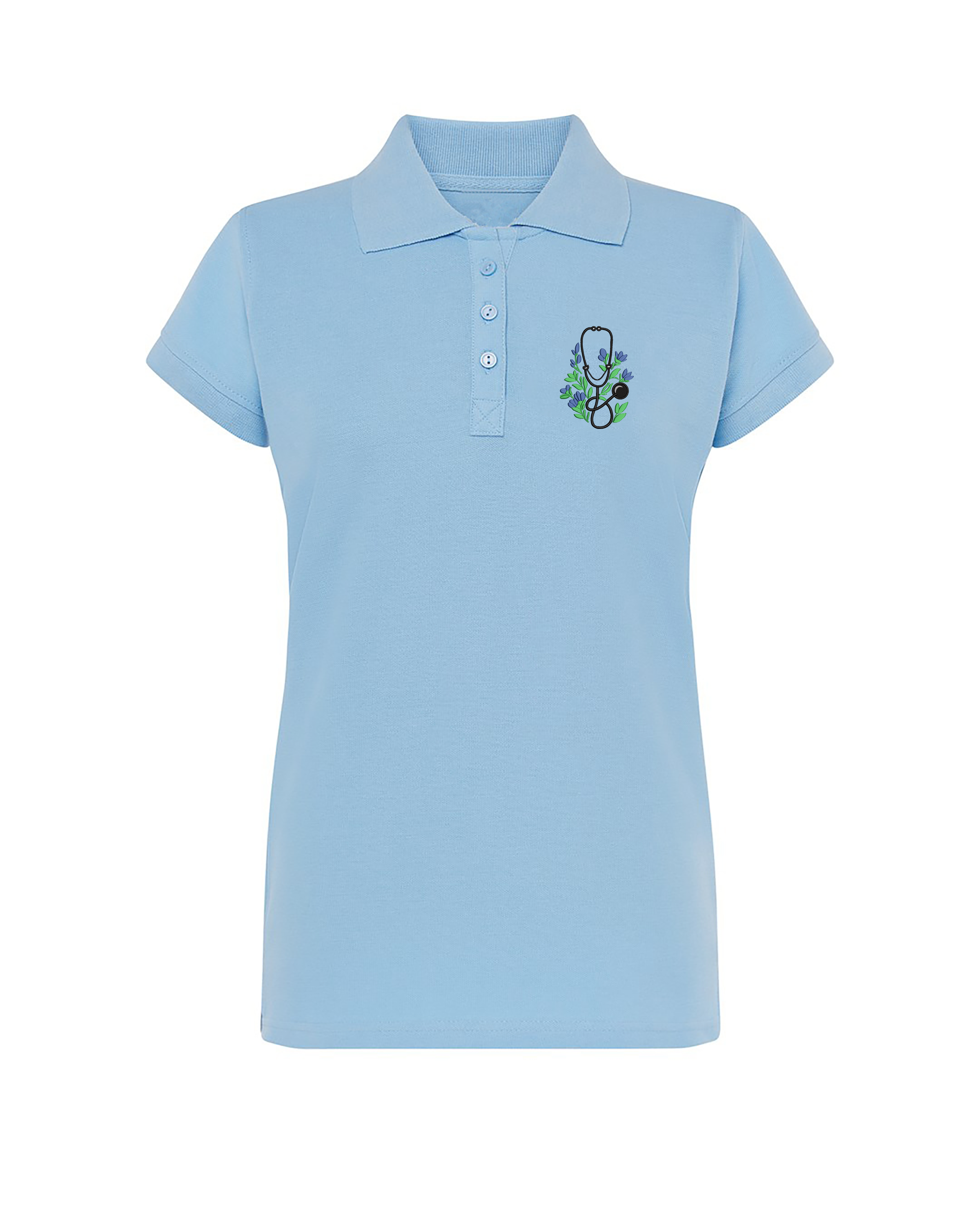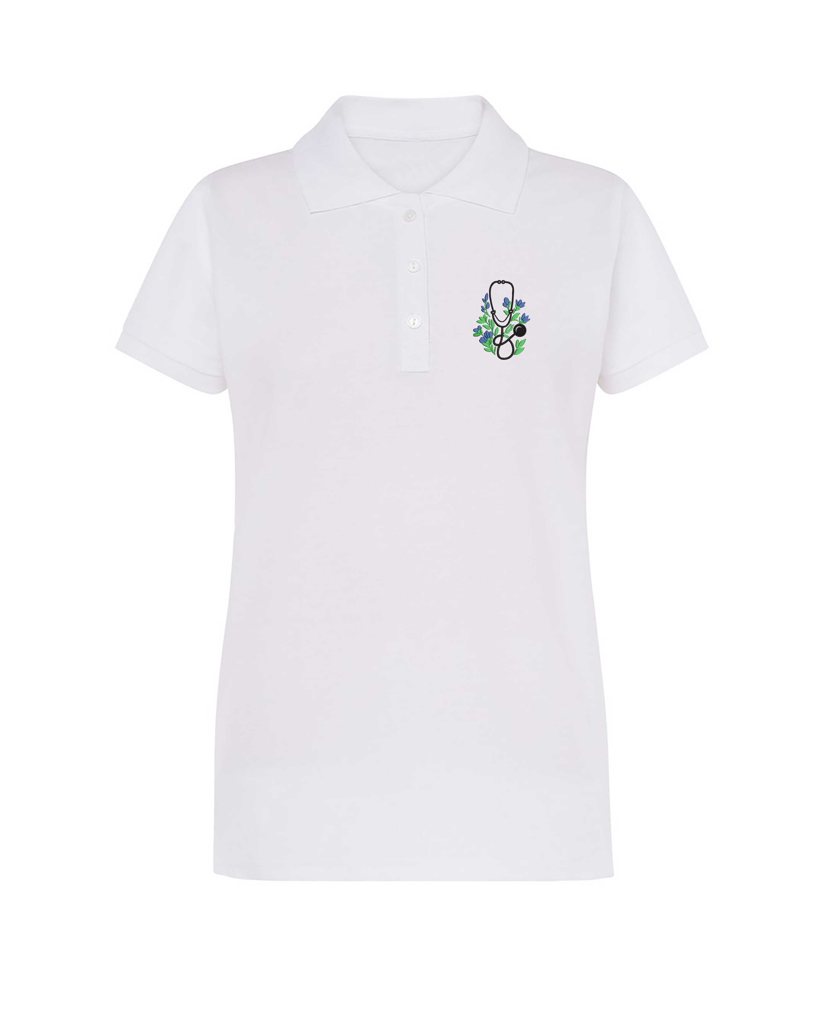 Dámska zdravotnícka polokošeľa s výšivkou "Kvitnúci fonendoskop" prináša jedinečné spojenie medicínskeho prostredia a jemnej symboliky prírody.