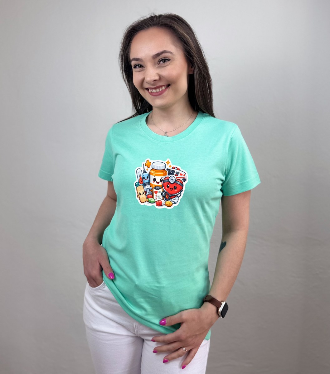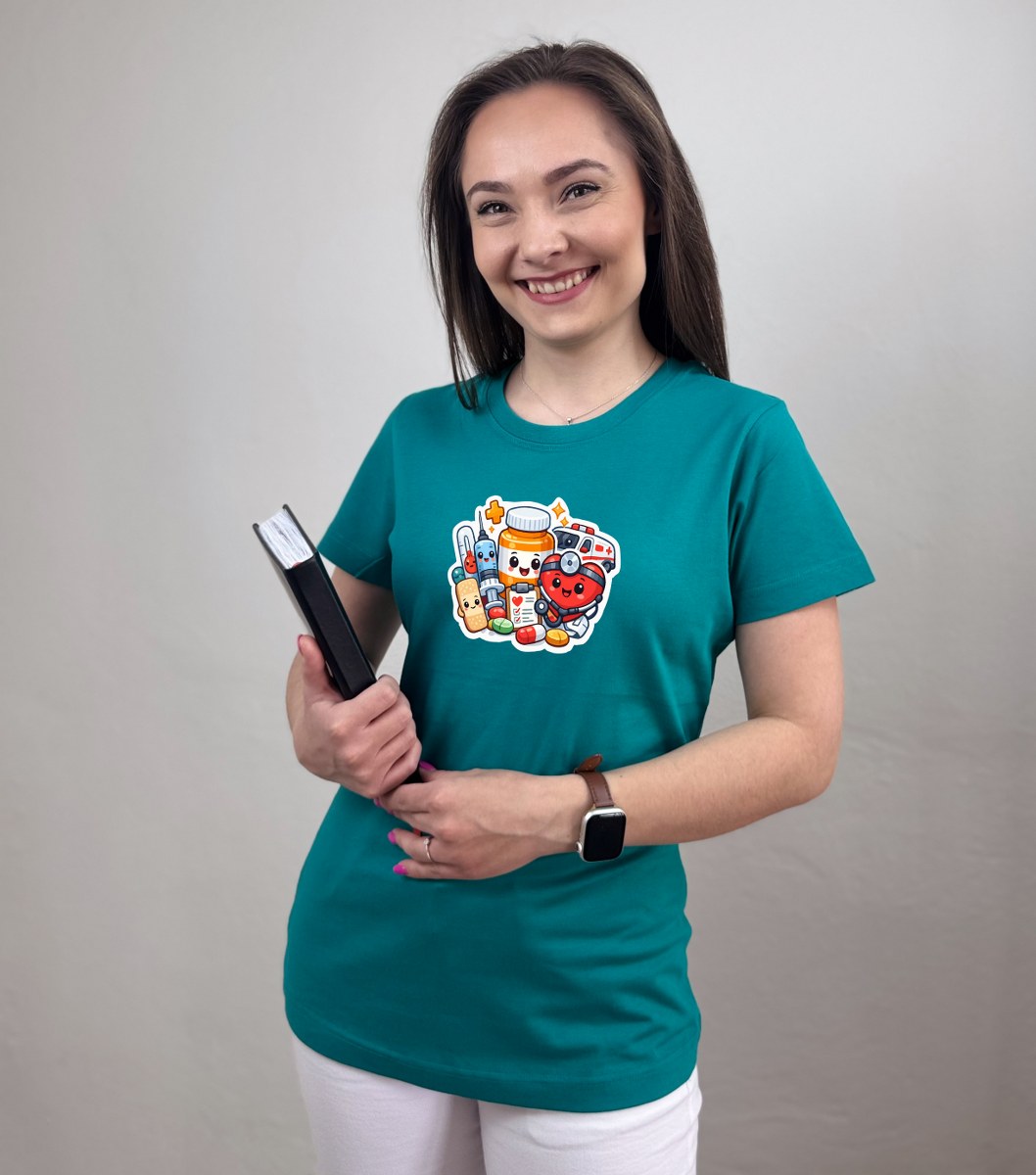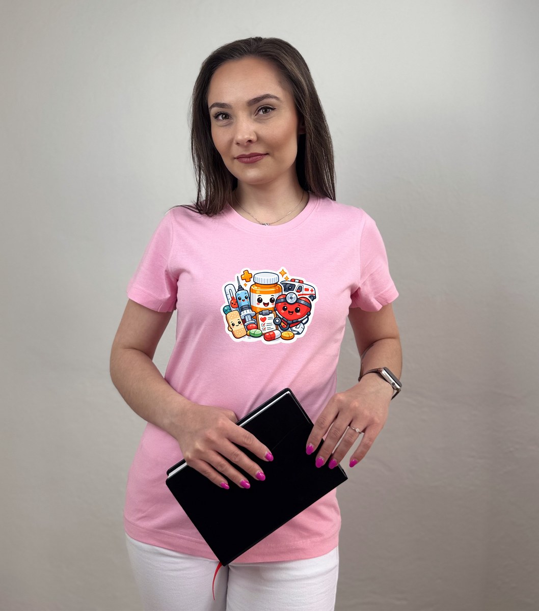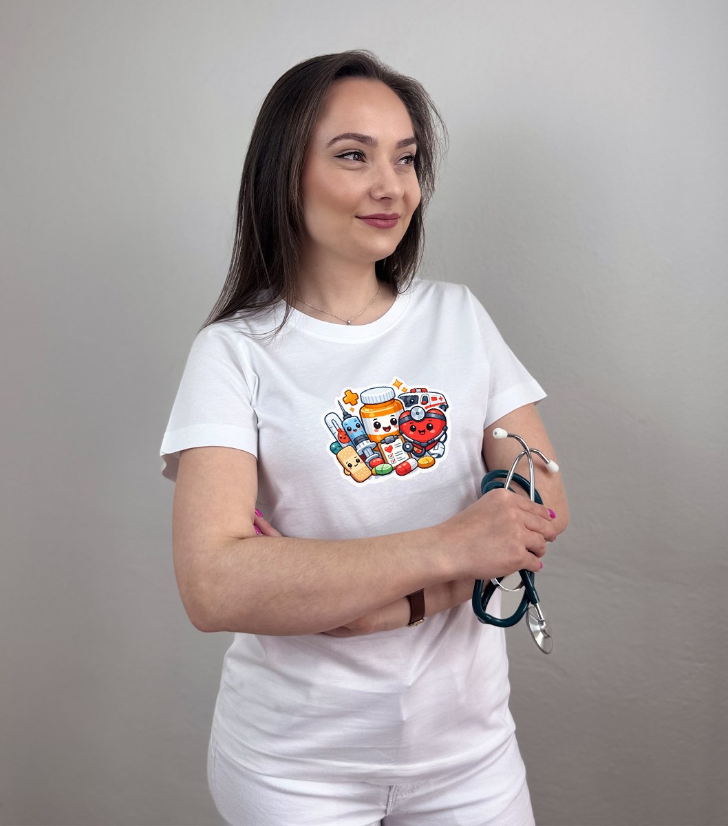 Zdravotnícke tričko Unidress s potlačou „usmievaví zdravotnícki hrdinovia“ prináša originálny a hravý dizajn, ktorý oživí každý pracovný deň. Motív tvoria usmievavé zdravotnícke pomôcky ako teplomer, srdiečko, tabletky, tuba na lieky či náplasť, ktoré spolu vytvárajú pozitívny a ľudský vizuál.