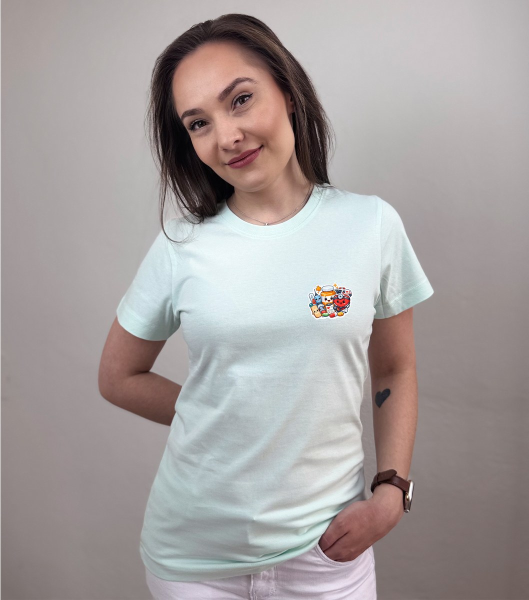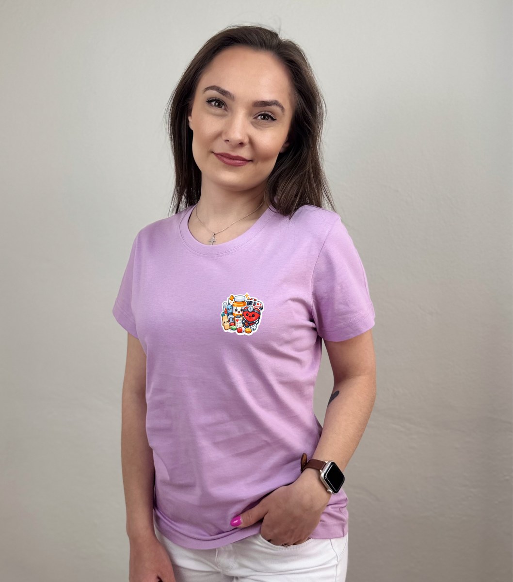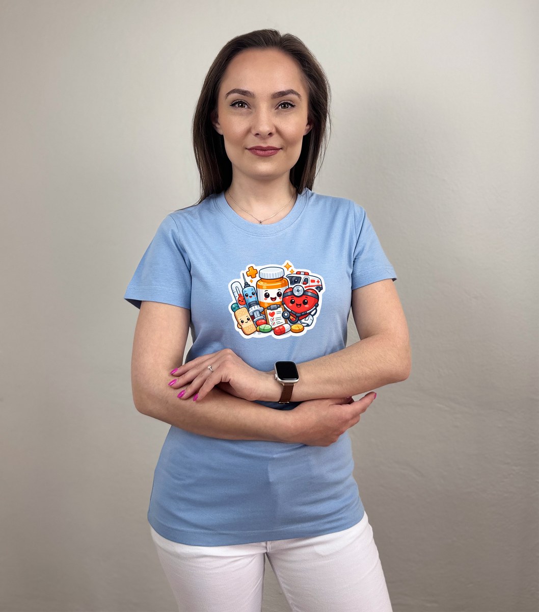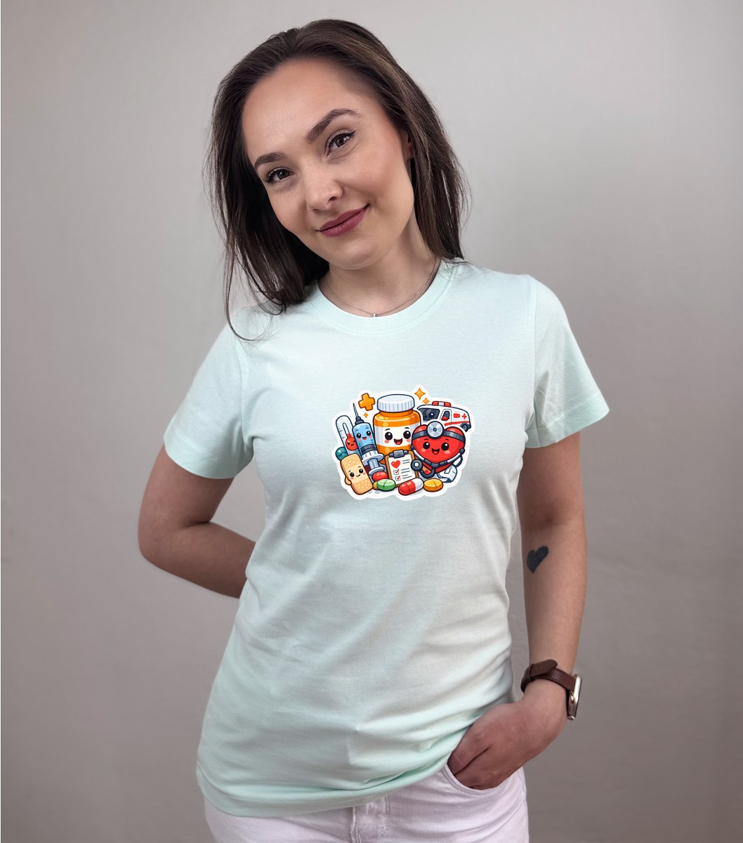 Zdravotnícke tričko Unidress s potlačou „usmievaví zdravotnícki hrdinovia“ prináša originálny a hravý dizajn, ktorý oživí každý pracovný deň. Motív tvoria usmievavé zdravotnícke pomôcky ako teplomer, srdiečko, tabletky, tuba na lieky či náplasť, ktoré spolu vytvárajú pozitívny a ľudský vizuál.
