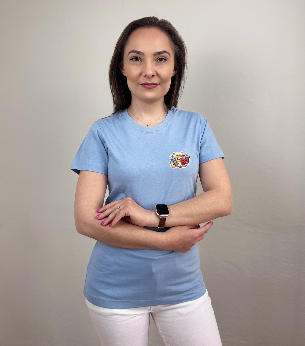 Takýto typ potlače je obľúbený najmä v prostredí, kde je dôležitá komunikácia s pacientom – pomáha odbúravať stres a pôsobí prívetivo najmä na detských oddeleniach alebo ambulanciách. Tričko je vyrobené zo 100 % bavlny s gramážou približne 160 g/m², čo zabezpečuje pohodlie pri celodennom nosení. Materiál je priedušný a vhodný na každodenné pracovné zaťaženie. Strih je zľahka vypasovaný s bočnými švami, čo zaručuje dobré prispôsobenie postave a voľnosť pohybu. Spevnené ramenné švy prispievajú k dlhšej životnosti aj pri častom praní.