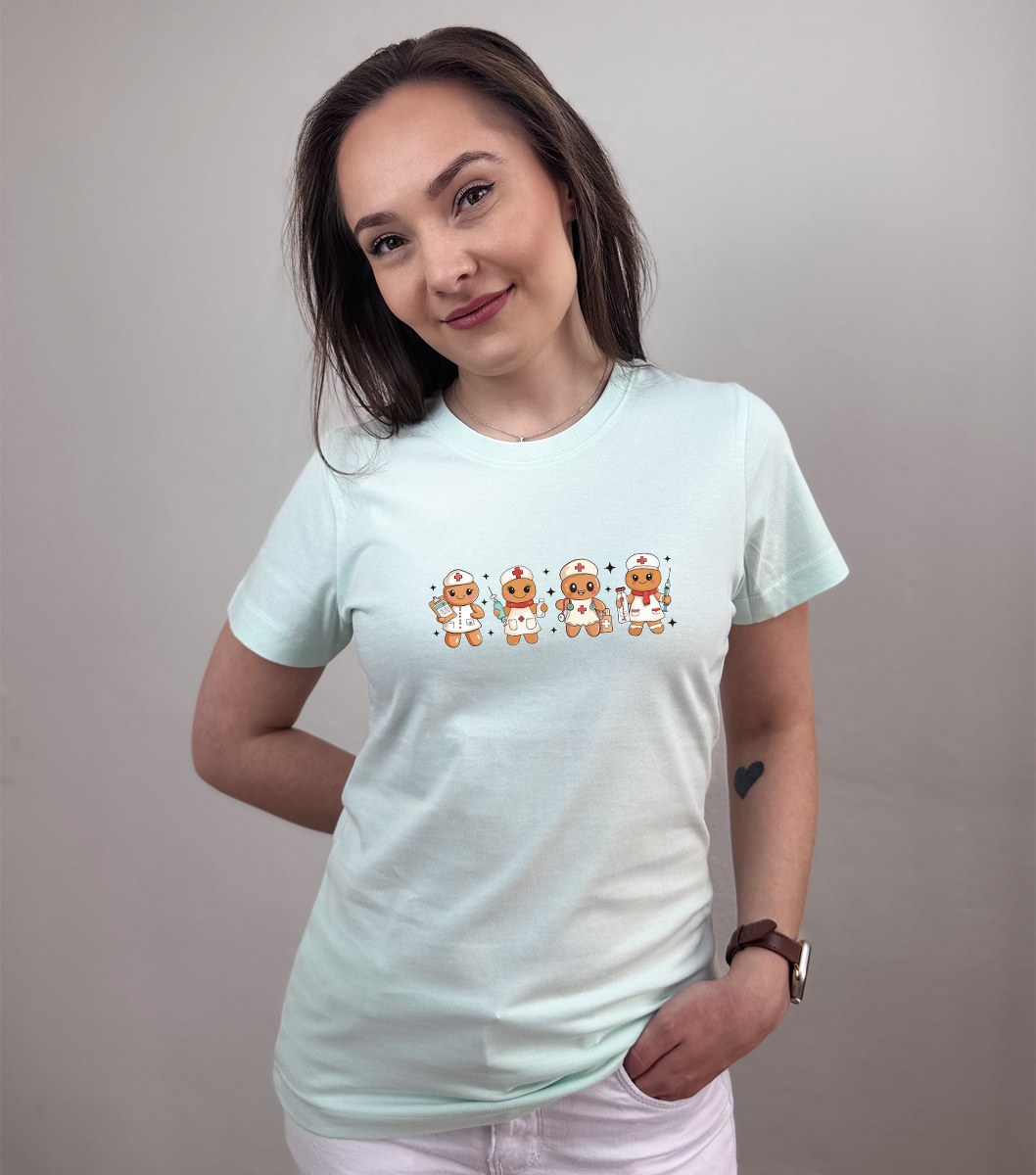 Vianočné tričko s potlačou zdravotníckeho tímu v podobe perníkov.